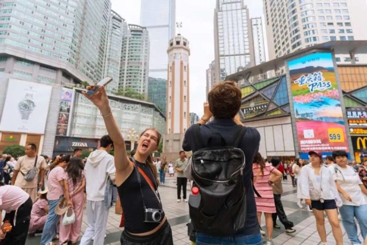 国庆期间,解放碑步行街吸引了众多中外游客。受访者供图