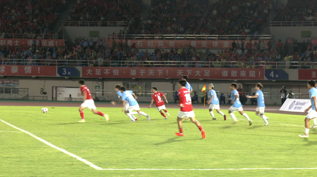 比赛尚未开场,球场已弥漫着紧张气息。19:30哨声吹响,双方即刻展开高强度对抗。大足石刻队依托主场优势发起猛攻,队员们配合默契,多次在对方禁区制造威胁;璧山狼队则凭借年轻球员的速度优势频频反击,攻防转换节奏快得让人目不暇接。上半场第21分,大足石刻队6号球员,接到3号队员传中,突入禁区头球破门,瞬间点燃全场。
