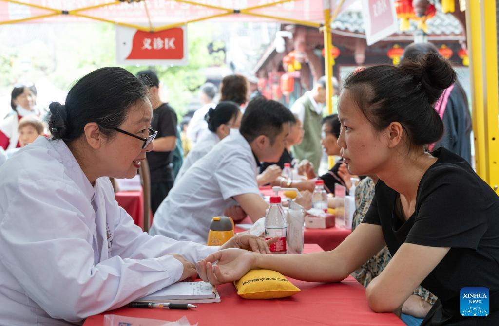 Citizens experience free diagnosis and treatment services at the Traditional Chinese Medicine (TCM) Street in Bishan District, southwest China's Chongqing Municipality, Sept. 30, 2025. The Traditional Chinese Medicine Street, a cultural block featuring traditional Chinese medicine, opened to public on Tuesday. Characteristic cultural fairs, free TCM clinics, and Qigong performances will be held here during the upcoming National Day holiday and the Mid-Autumn Festival. (Xinhua/Chen Cheng)