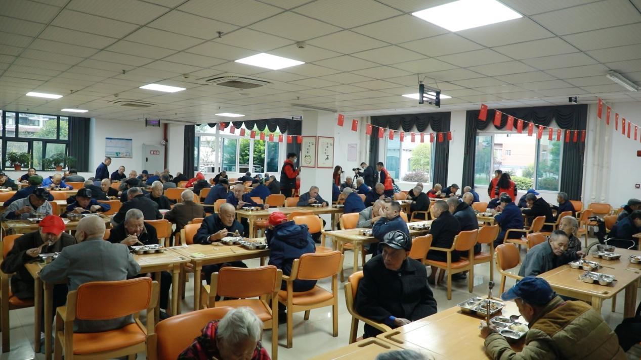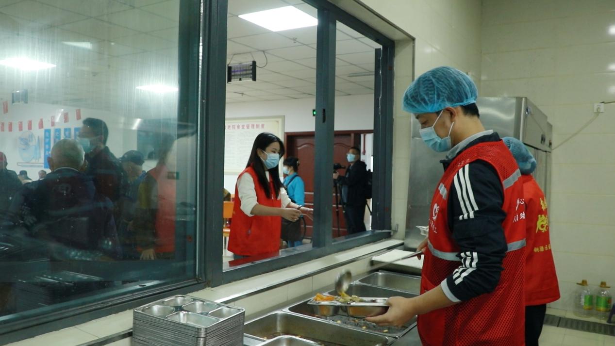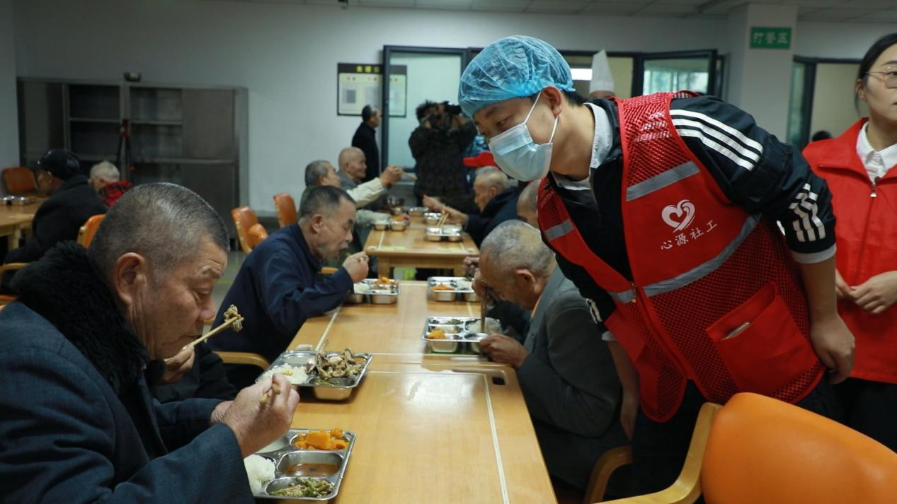除了这道备受追捧的美蛙鱼,当天的餐桌上还摆上了蒸南瓜、青椒肉丝和萝卜汤。志愿者不仅为老人们打饭盛菜,还围坐在一起与他们交流话家常。现场氛围温馨融洽,不少老人对美蛙鱼情有独钟,特意二次添菜。