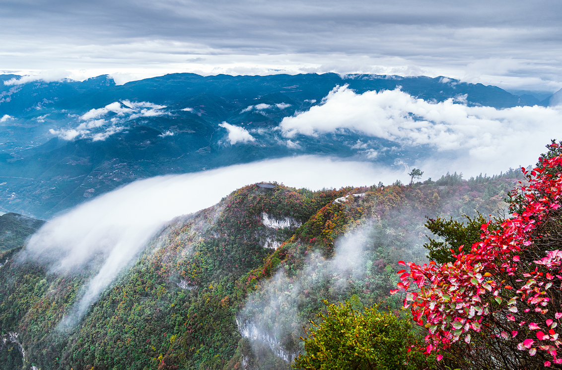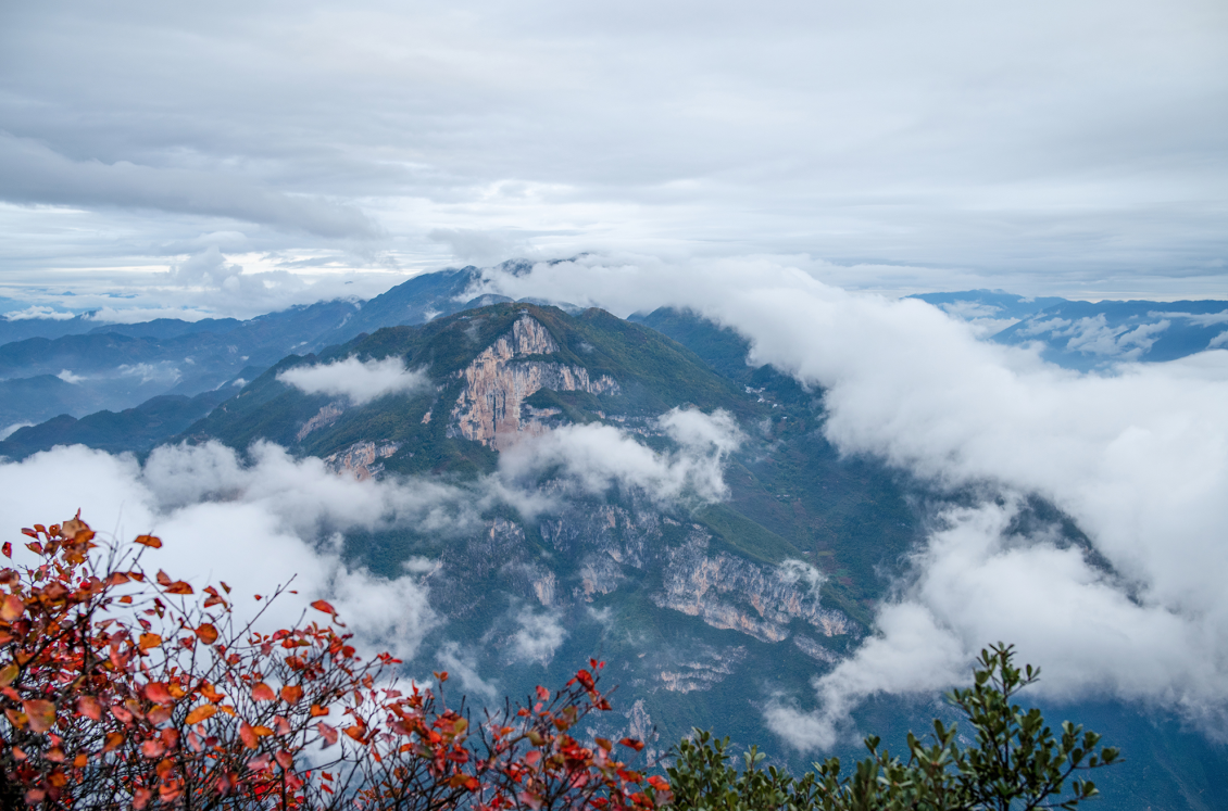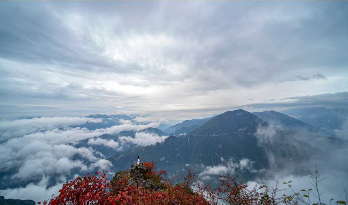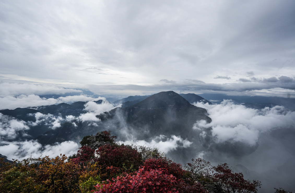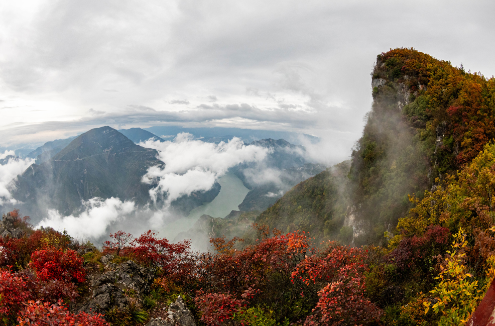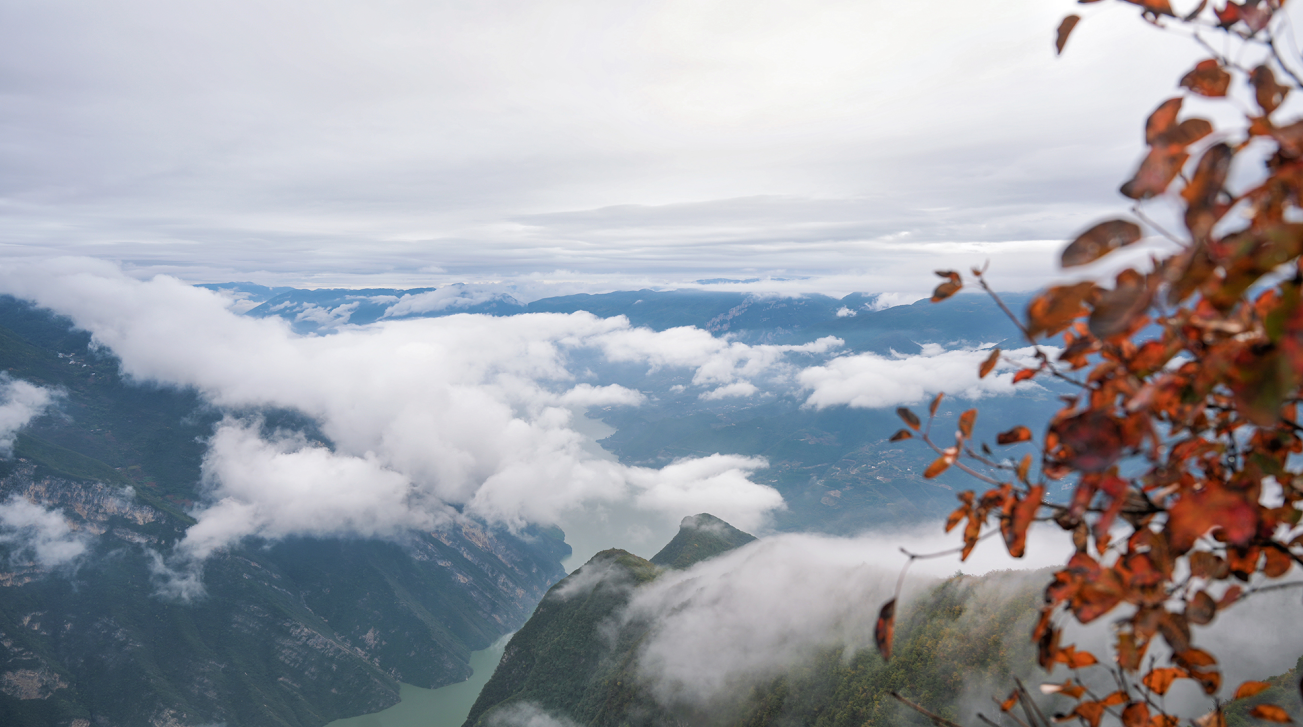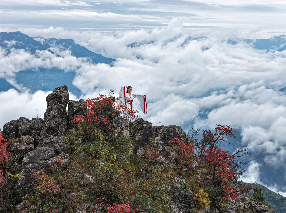 行摄三峡之间,聚焦光影变幻,拍尽万山红叶。深入三峡,于黎明定格山河云海红叶的壮丽画卷;在瞿塘峡用镜头捕捉“两岸猿声啼不住”的诗意景致;于飞凤峰拍摄巫峡大背峡的雄浑气韵。而在千仞绝壁之巅,白衣侠客临风而立,绯红的枫浪与素白的身影在云雾间交织,刚劲山峦与飘逸身姿相映,更是东方美学的极致写意。