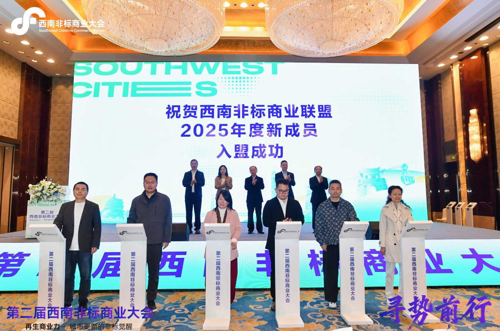 此外,西南非标商业联盟新成员入盟仪式也于当日举行。渝中区委书记黄茂军,渝中区委副书记、区政府区长谢东,重庆市商务委员会副主任叶力娜,渝中区委常委、区政府副区长罗毅,重庆市住房和城乡建设委员会总工程师王慎川共同登台见证这一重要时刻。联盟阵容的持续扩容,不仅彰显了西南非标商业领域的蓬勃发展态势,更将通过资源整合、优势互补,凝聚区域发展合力,为非标商业规范化运营、规模化发展提供支撑,助推西南地区商业创新迈向高质量发展新阶段。