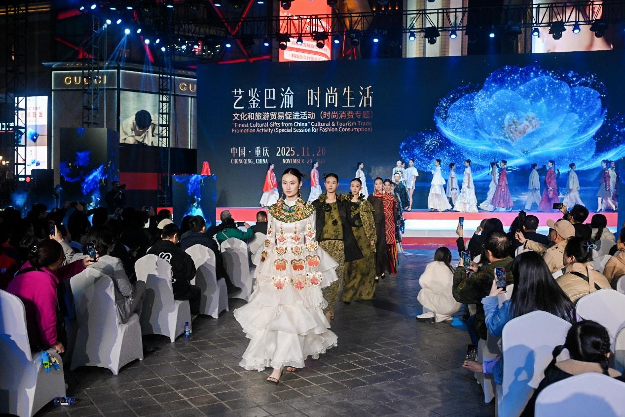 11月20日晚,“多彩中国佳节好物”文化和旅游贸易促进活动(时尚消费专题)的系列活动“艺鉴巴渝时尚生活”时尚首秀,在渝中区解放碑CBD精彩上演,以非遗技艺与当代设计的碰撞,为市民游客呈现了一场兼具视觉冲击与文化深度的美学盛宴。
