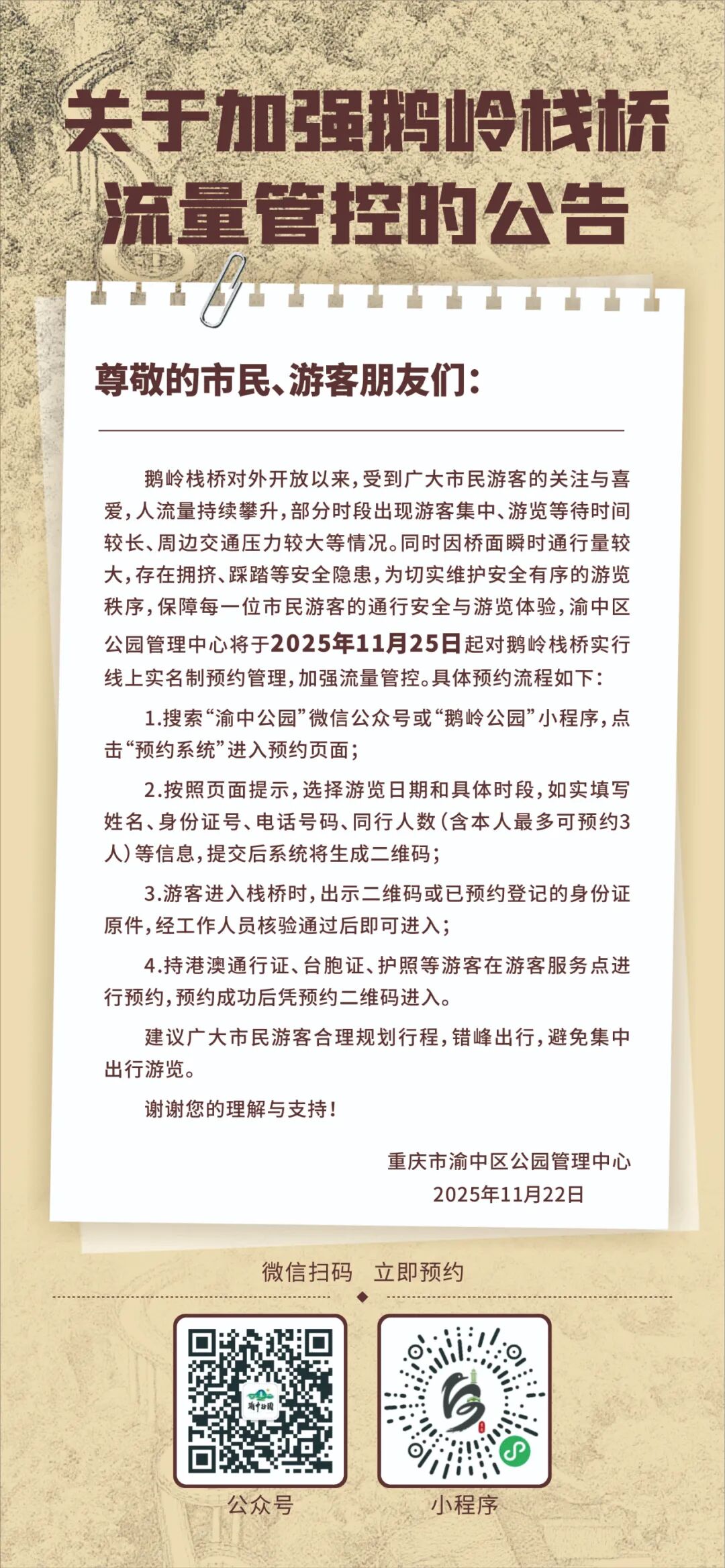 11月22日,重庆市渝中区公园管理中心发布公告:鹅岭栈桥对外开放以来,受到广大市民游客的关注与喜爱,人流量持续攀升,部分时段出现游客集中、游览等待时间较长、周边交通压力较大等情况。同时因桥面瞬时通行量较大,存在拥挤、踩踏等安全隐患,为切实维护安全有序的游览秩序,保障每一位市民游客的通行安全与游览体验,渝中区公园管理中心将于2025年11月25日起对鹅岭栈桥实行线上实名制预约管理,加强流量管控。