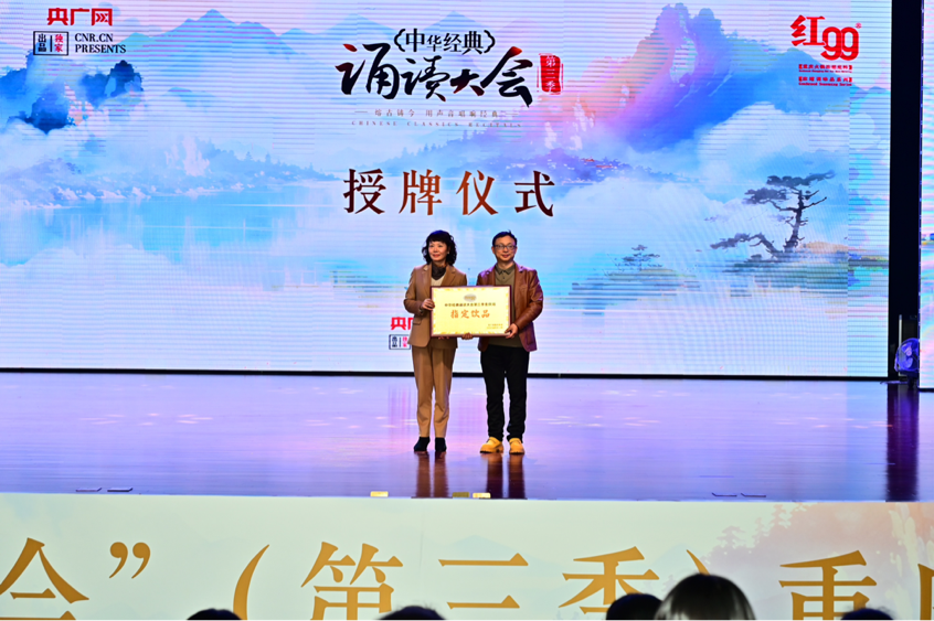 活动现场,央广网副总裁朱建勇、央广网重庆频道负责人周伟分别为中华经典诵读战略合作伙伴重庆红九九食品有限公司、指定饮品荷包蛋授牌。