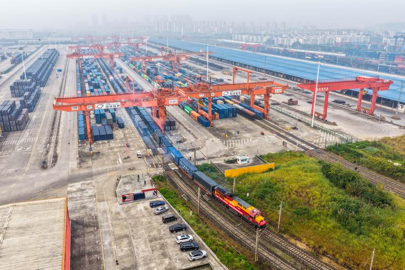 ▲11月30日,重庆—匈牙利布达佩斯全程时刻表中欧班列在重庆团结村中心站顺利发车(无人机照片)。新华社记者唐奕摄