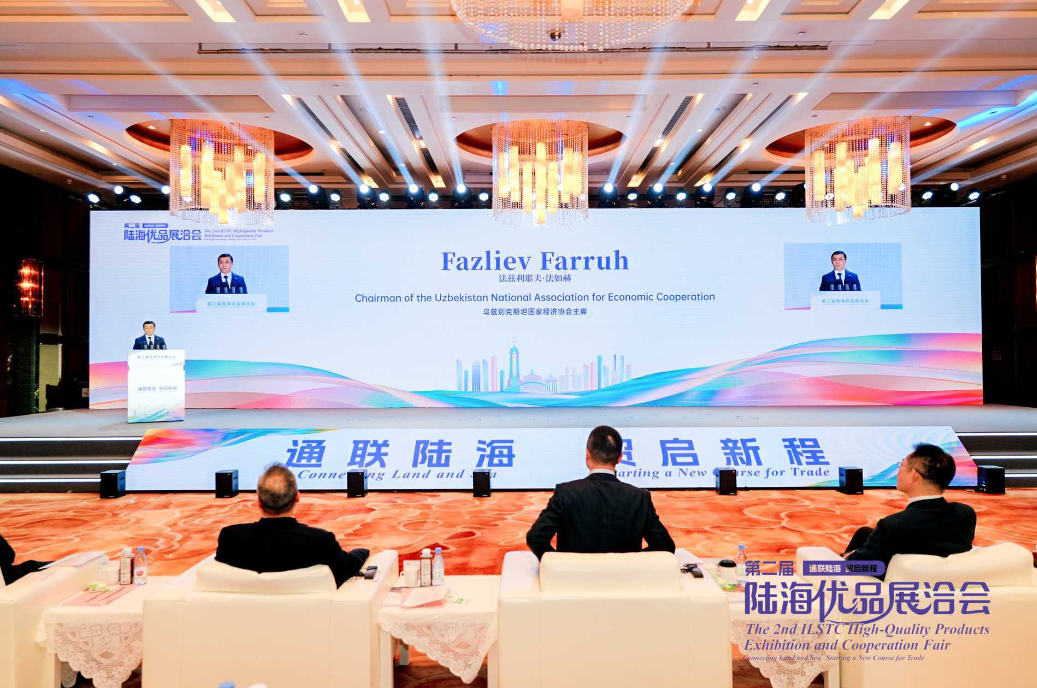 乌兹别克斯坦国家经济协会主席法兹利耶夫·法如赫作为陆海新通道工商会联盟代表发言;重庆市跨境电子商务协会围绕“跨境电商助力产品出海”作专题分享。