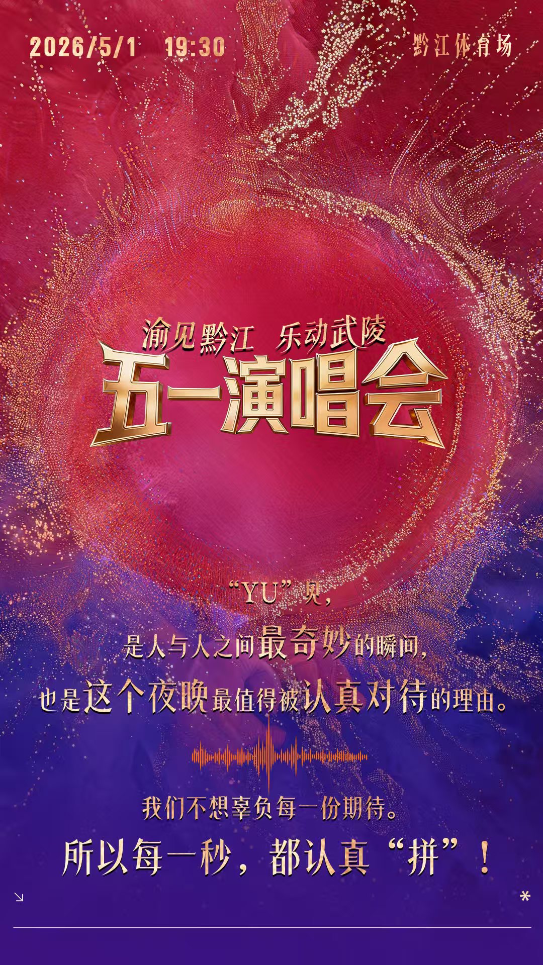 “渝见黔江·乐动武陵”五一演唱会定档5月1日,落地重庆黔江体育场,GAI(周延)、张靓颖、王蓉、四熹丸子(徐化文)四大实力唱将齐聚,顶级舞美+惊喜福利拉满。